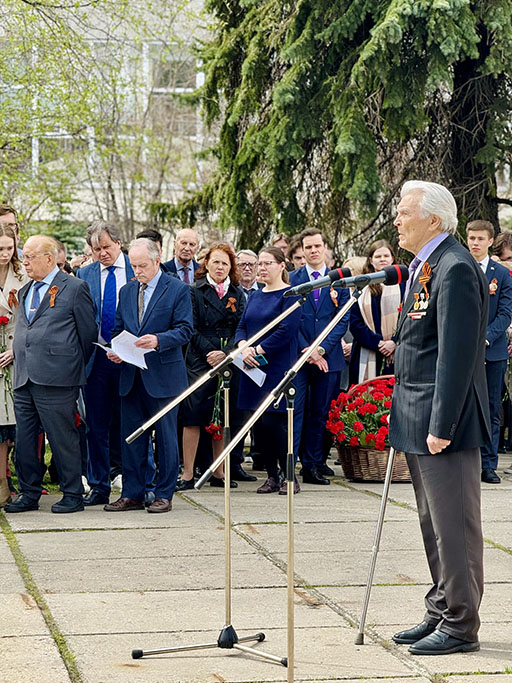 После минуты молчания от имени Совета ветеранов войны и труда МГУ с наступающим Днем Победы собравшихся поздравили профессор механико-математического факультета Виктор Яковлевич Шкадов, узник фашистских лагерей, и студент исторического факультета Тимур Усманов. По окончании митинга состоялось возложение венков и цветов к монументу студентам и сотрудникам МГУ – героическим защитникам Родины в годы Великой Отечественной войны.